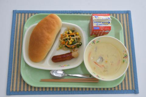 コーンポタージュは、クリームコーンとホールコーンの2種類のコーンを使っています。クリームコーンは、とうもろこしの粒を切り落とし、ミキサーでつぶしてクリーム状にし、塩、砂糖、でん粉などを加えて作ったもので、ホールコーンは、粒のままのものです。コーンの食感の違いを楽しみましょう。