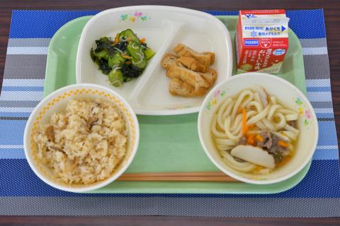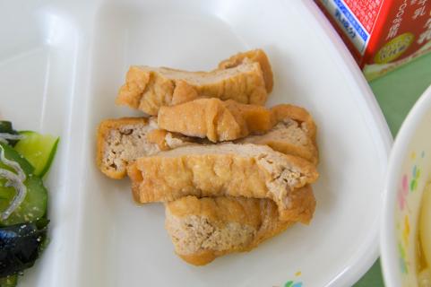 うどんと言えば油揚げの入った「きつねうどん」が定番ですが、どうして名前に「きつね」がつくか知っていますか?それは、きつねの好物が油揚げだという言い伝えがあるからです。他に、油揚げの色がきつねの色に似ているから、きつねがうずくまった姿に形が似ているから、といった説もあります。今日は、小さく切って作っているので、「子ぎつね煮」と名付けました。うどんに入れて食べてください。