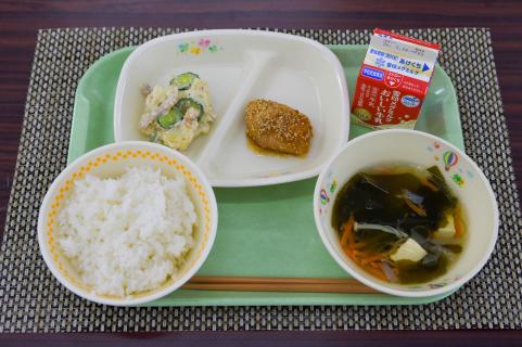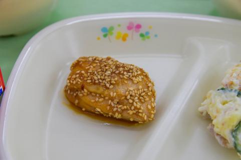 給食の味付けには米から作られた米酢を使っています。酸味で食欲を増し、消化吸収を助け、疲労回復に効果があります。今日は、ごまと合わせてごま酢にして鶏肉にかけています。